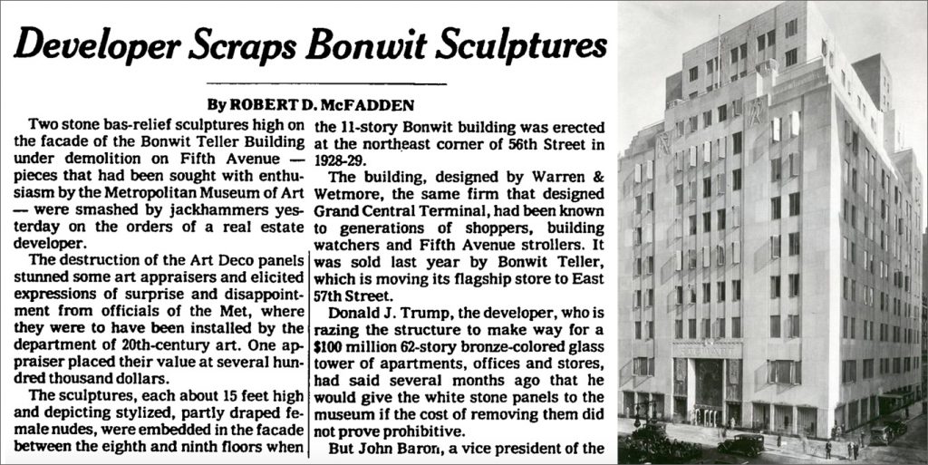 It caught my eye because I knew the building, having gone, as a twelve-year-old, on a shopping expedition with my mother to Bonwit’s, as she called it. I was not interested in the shopping then, but I was now interested in the architecture and the art. The Metropolitan Museum of Art had wanted the two limestone sculptures on the top of the building, considering them good examples of the Deco period in American design. The developer had promised that he would give them to the museum, but, with no explanation, he reneged and had his demolition crew jackhammered them into rubble. The developer then spun some inflated cost figures and said the pieces were “without artistic merit.”