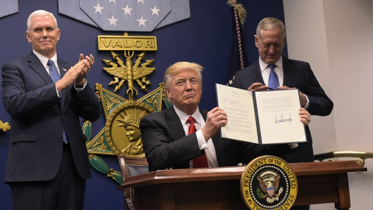 The photograph is of Trump displaying the executive order. He has just signed it. Note behind him is the Congressional Medal of Honor, the word “Valor” prominently displayed.